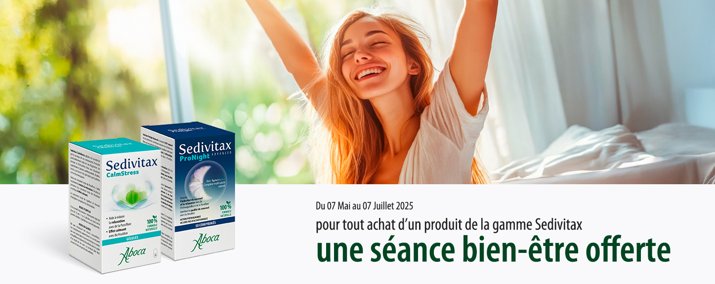 *Offre soumise à conditions, nominative, limitée à une participation par personne (même nom, même prénom) et par adresse e-mail, réservée aux personnes physiques majeures résidant en France métropolitaine, valable pour l’achat d’un produit de la gamme « Sedivitax » (Sedivitax Pronight Advanced 27 comprimés, Sedivitax Calmstress 30 gélules ou Sedivitax Calmstress 50 gélules) dans les pharmacies participantes entre le 07/05/2025 et le 28/07/2025 inclus. Voir les modalités complètes